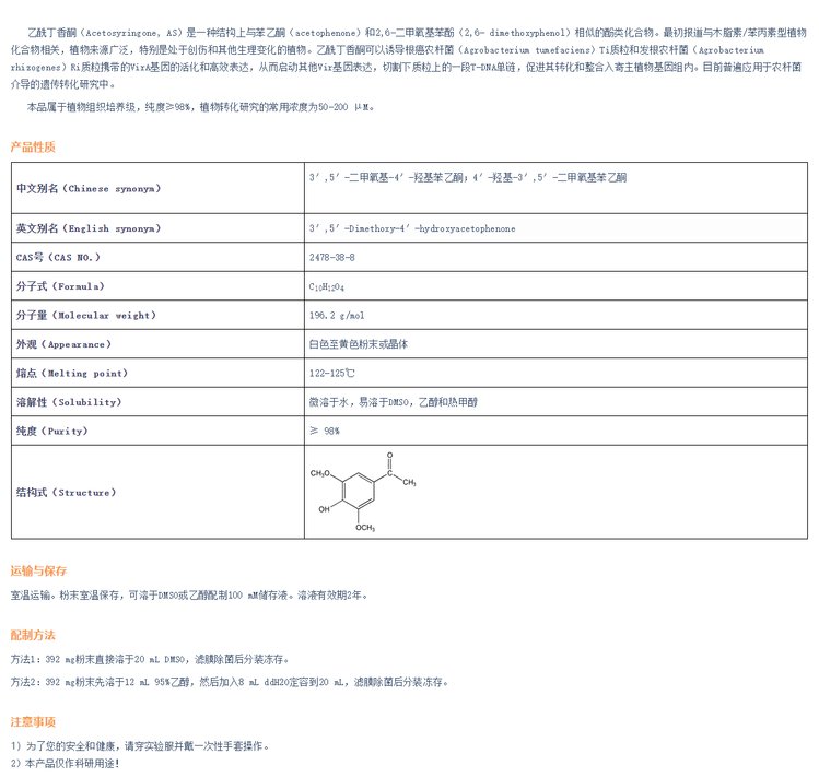 乙酰丁香酮 酚类化合物|Acetosyringone AS|CAS 2478-38-8